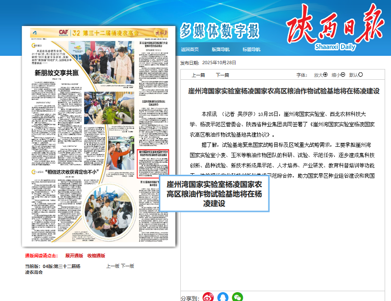【陕西日报】崖州湾国家实验室杨凌国家农高区粮油作物试验基地将在杨凌建设